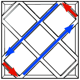 As stated before, the red line is the string above the tile, the blue is the string passing beneath the tile.