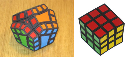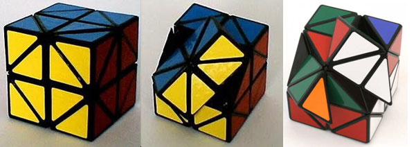Some twisty puzzle designers specialize in "modding" of twisty puzzles by cutting off corners or adding extensions. A famous example is the Fisher Cube [7], see Figure 3. Mathematically it turns like a (doctrinaire) Rubik's Cube.