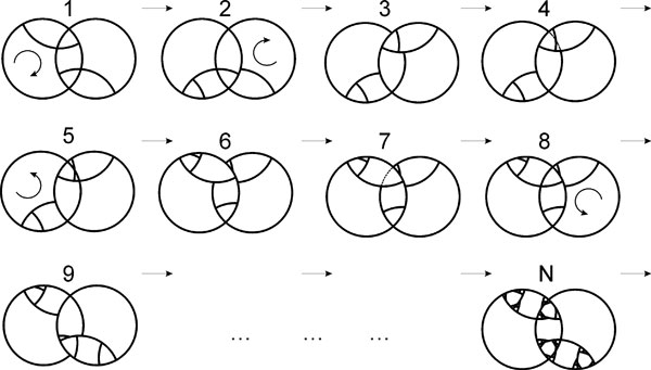 The core part of the definition is "cannot be unbandaged". Figure 5 shows a simple flat twisty puzzle and some vain attempts to unbandaged it. Step 1 shows the start position. After two moves, the left circle is blocked. By cutting two pieces ("unbandaging"), the left circle can turn again. But when turning it, the right circle is blocked. After some more cutting the right circle can turn again, but now the left circle is blocked. More cutting to do. The result is a never ending process of turning and cutting, ultimately cutting the puzzle to dust. It may be clear that this puzzle cannot be unbandaged into a doctrinaire puzzle, so it jumbles.