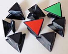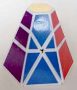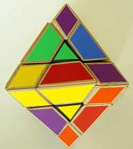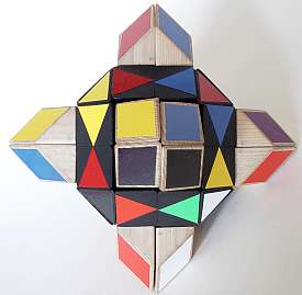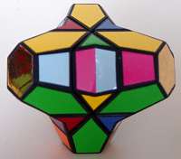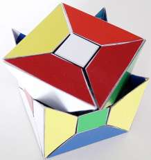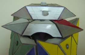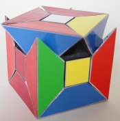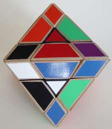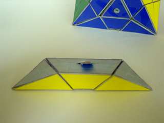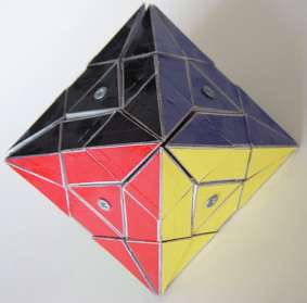 The entire puzzle moves reasonably well as long as not too large forces are applied onto the (moving) parts. Another easier way of making a "Face-turned Octahedron" is to make use of a "Rainbow cube" and attach small pointed pieces onto each of the square faces of the "Rainbow cube", as is illustrated below, of cardboard pieces.