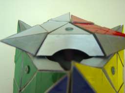 Each "face" consists of 4 pieces, the 3 turning edge parts and a centre part. The centre parts are attached by means of long screws and via hollow rods onto an octahedron centre core made from "filled" cardboard. The moving sides are attached to the centre parts by means of small lids.
