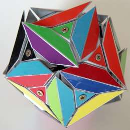 In a similar way as the "Face-turning Octahedron" Jürgen has also made a "Face-turning Icosahedron". The puzzle is made using a centre "Dodecahedron" shaped core, hollow distance rods, screws (all "inside") and the centre pieces and turning pieces on the outside of the puzzle. The puzzle can be played with, but due to the large openings on the inside it has to be used rather carefully.