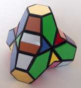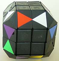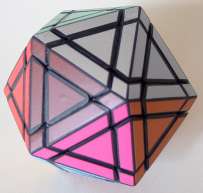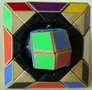 The puzzle has many hollow areas allowing 4 edges to move simultaneously. The core of the puzzle is a regular 333 cube. The corners are largely truncated (these are not "functional" and should allow the edge pieces to move "inside" the puzzle). The edge pieces consist of thin material (e.g. 1 mm) attached to each of the 12 edge pieces of the 333 cube. The puzzle is not very difficult to solve, but has a nice appearance. It is very special in the sense that certain pieces move underneath neighbouring pieces.